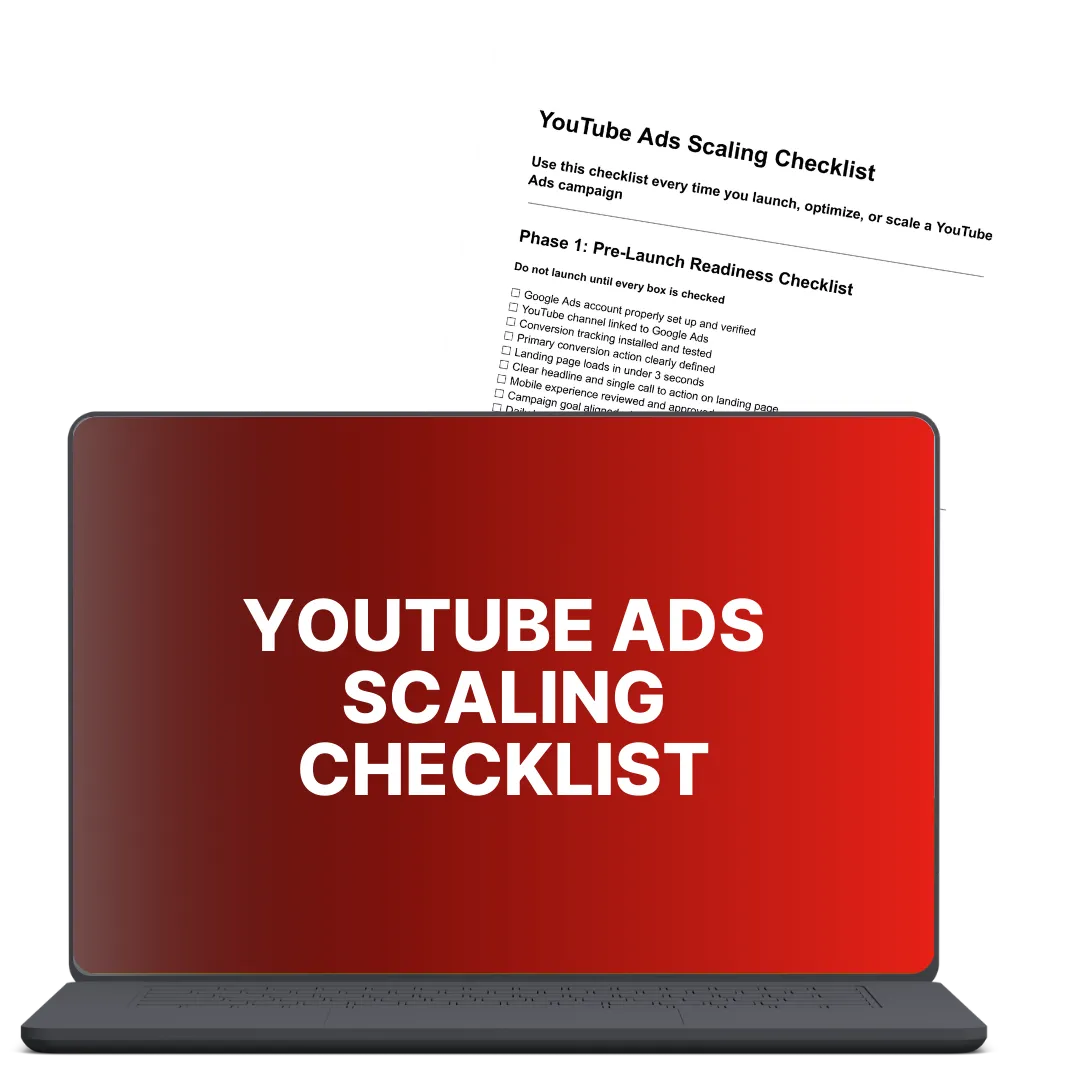 • BONUS #4: YouTube Ads Scaling Checklist - A step by step checklist that shows you exactly what to do before launching, optimizing, and scaling your campaigns. Use it to avoid wasted spend, protect winning ads, and scale with control and confidence.